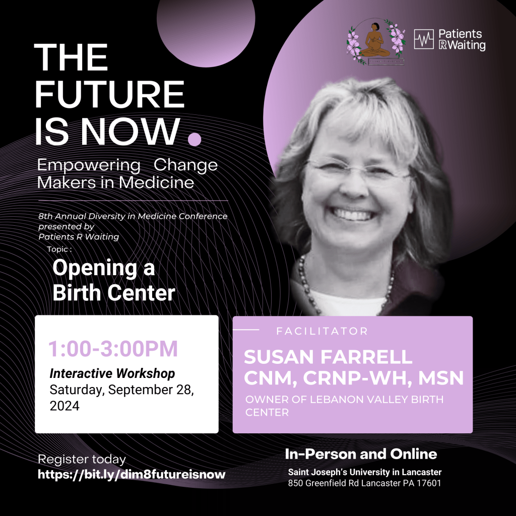 We are excited to announce that our founder and director, Susan Farrell, CNM, CRNP-WH, will be presenting an interactive workshop at the 8th Annual Diversity in Medicine conference, held September 28 at Saint Joseph’s University in Lancaster, PA. Her workshop, titled “Opening a Birth Center,” will present attendees with the tools and plans required to open a birth center in Pennsylvania, with a focus on underserved communities.